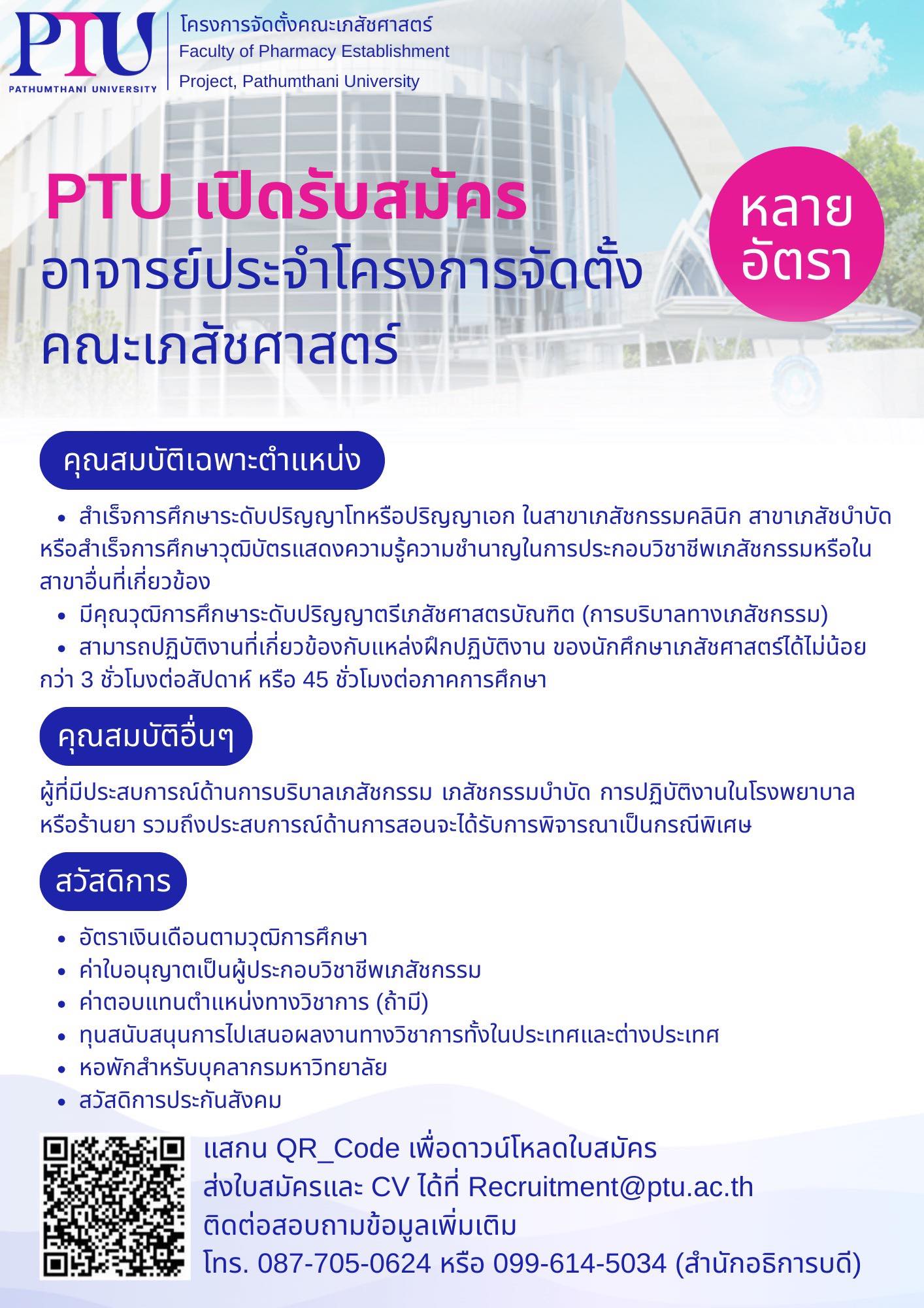 มหาวิทยาลัยปทุมธานี เปิดรับสมัครบุคลากรเพื่อร่วมเป็นส่วนหนึ่งในโครงการจัดตั้งคณะเภสัชศาสตร์